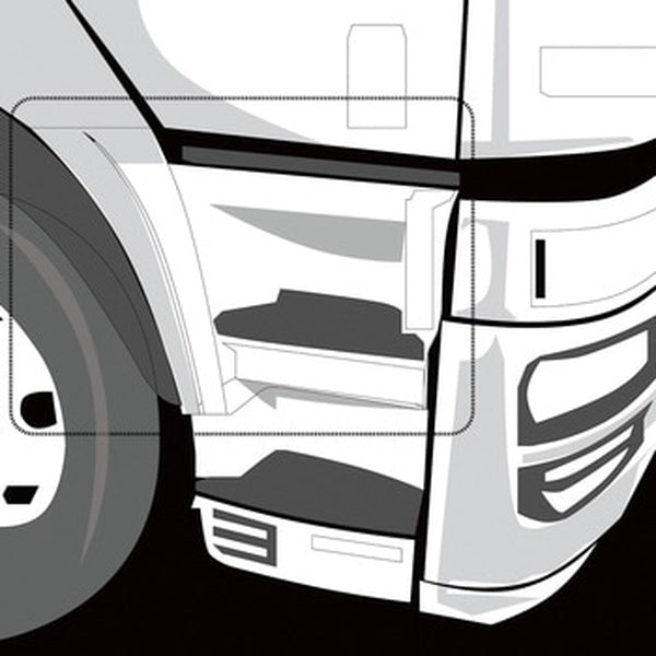| 標準キャブ車及び前輪2軸車には取付出来ません。取付に必要な部材は純正品をご利用下さい。本製品には塗装されている箇所がございます。 |