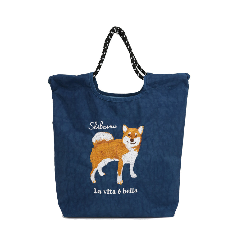 愛嬌のある表情が可愛い犬と猫の刺繡がポイントのコードトートです。