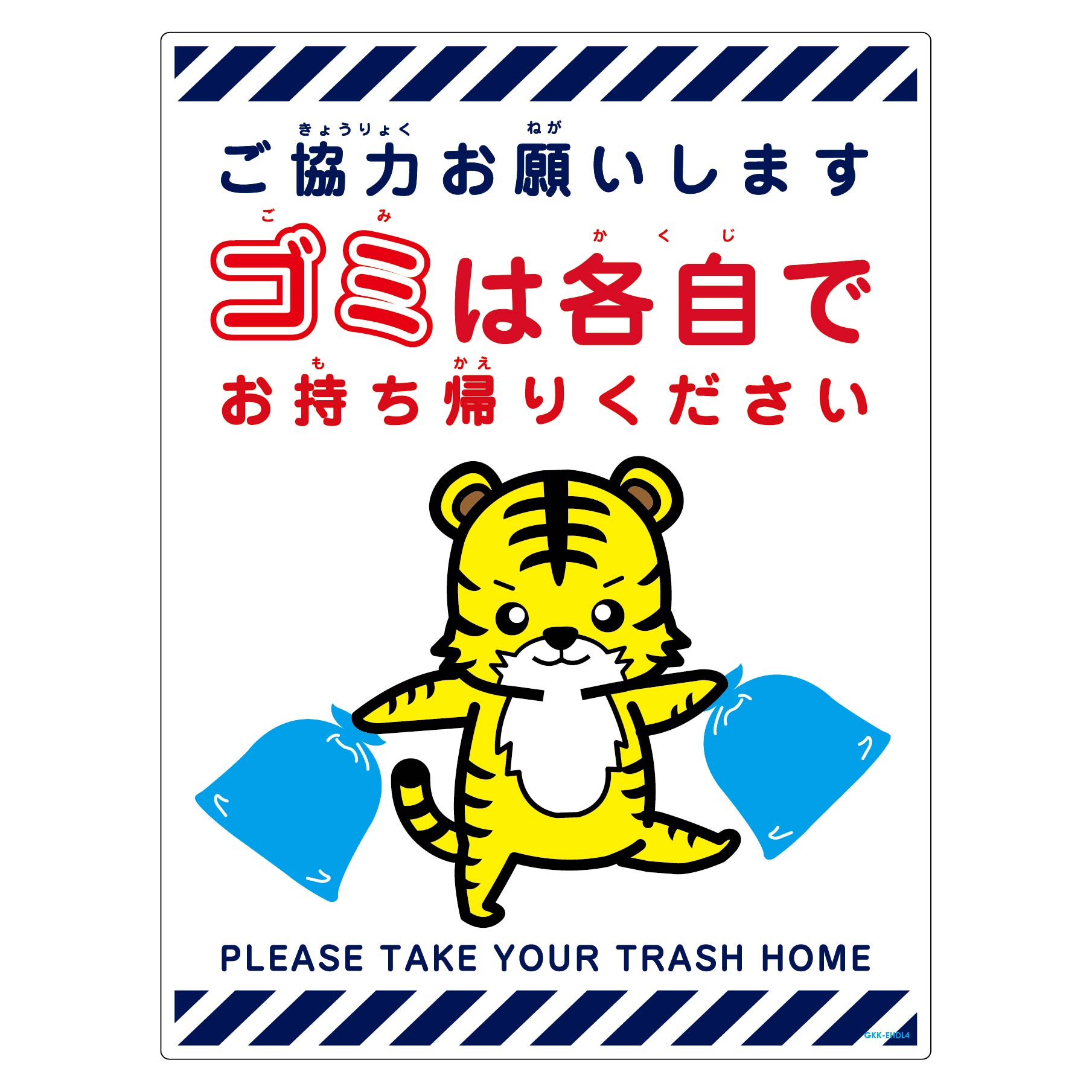 ゴミは各自持ち帰り標識動物柄PP縦大トラ白H600XW450