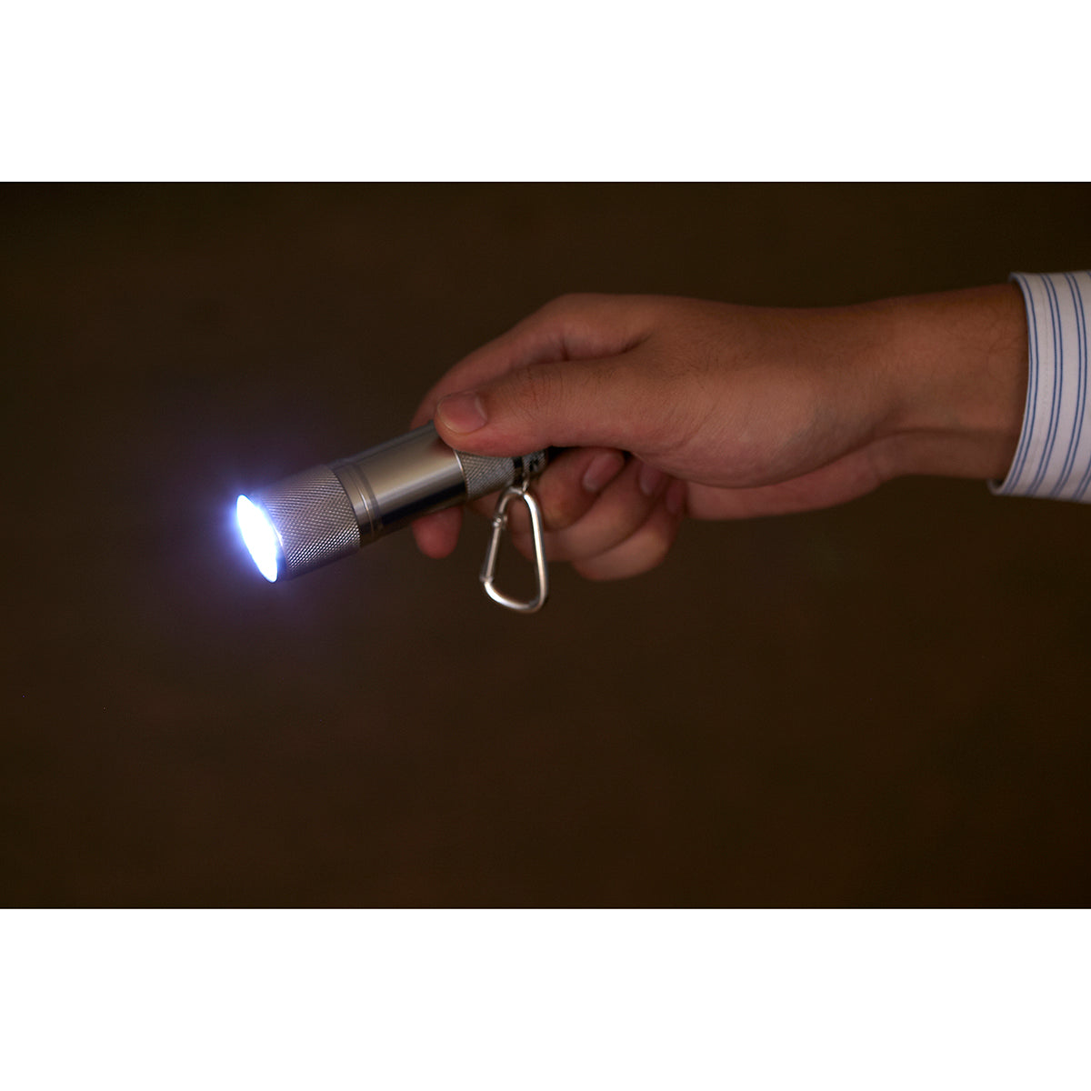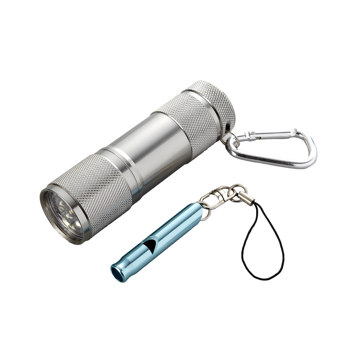 ストラップ付きアルミ製ホイッスル&防水性能IPX3単4形乾電池使用のアルミ製LEDライトのセット商品です。
