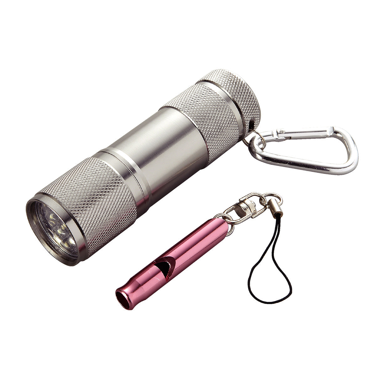 ストラップ付きアルミ製ホイッスル&防水性能IPX3単4形乾電池使用のアルミ製LEDライトのセット商品です。