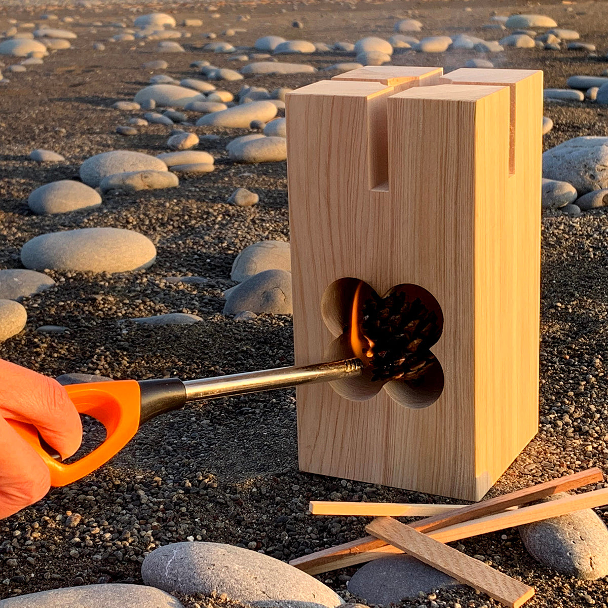 松ぼっくりが天然の着火剤となるのでインテリアとして使用した後はアウトドアでの調理・焚き火で燃え尽きるまで楽しめます。