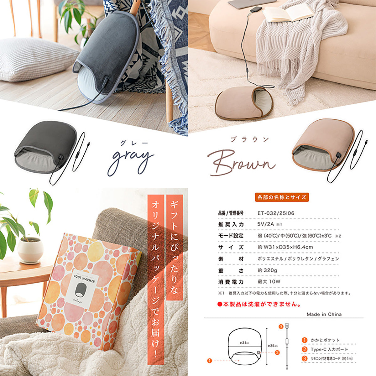 ENETANPO フットウォーマー グラフェン発熱 3段階温度 USB給電 かかとカバー付 グレー |