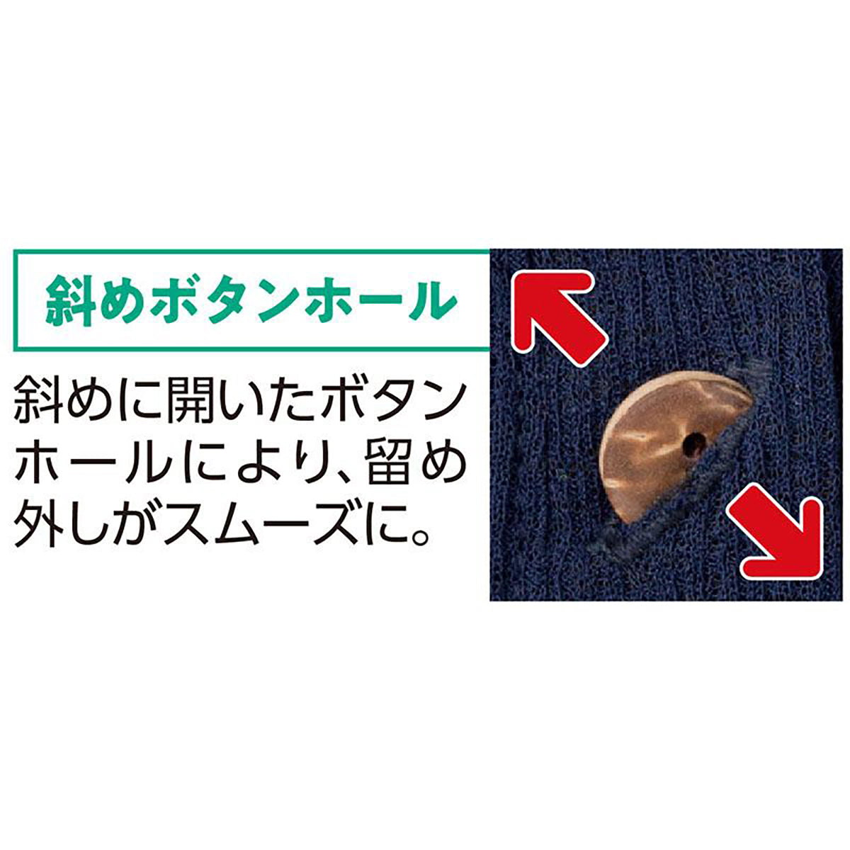 斜めのボタンホールに大きめぼたんで着脱簡単です。