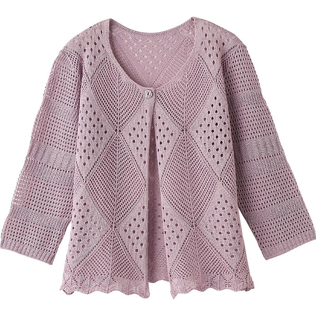 7分袖透かしダイヤ柄トッパーカーディガン ラベンダー M~L |