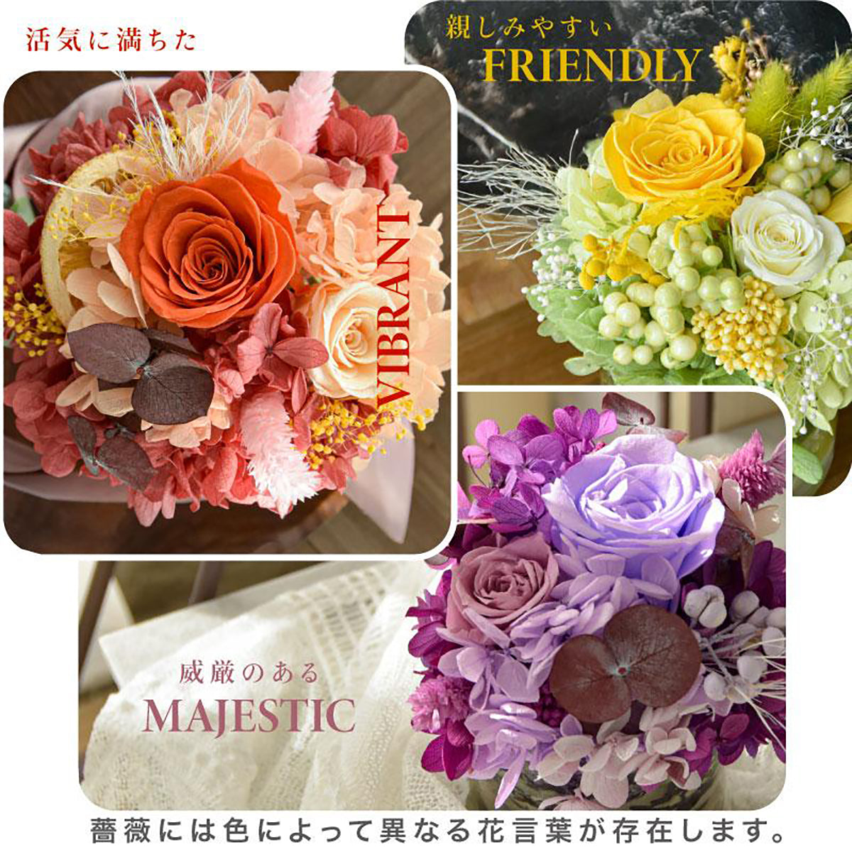 鮮やかなプリザーブドフラワーと花材を閉じ込めたクリアグラスが織りなす、新発想のフラワーギフトです。生花の美しさを長期間楽しめる特殊加工で、水やり不要・無香料・花粉なし。約10種類の花材を立体的にアレンジし、透明感あふれるジェルで彩りました。横浜老舗店プロデュースの上質なデザインと、リボン付き専用ギフトボックスで特別な日の贈り物に最適です。